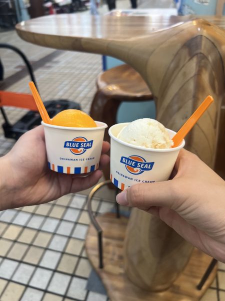 ○私は国際通りで撮った写真を選びました。1日目に国際通りを通って、行きたいお店が沢山あったのでとても楽しみにしていました。外国人の方もとても多くて国際通りはやっぱり人気な観光地なんだと感じました。お土産屋さんはどこも売っている物の種類が多くてどれを買って帰るか迷いました。沖縄にはこんなに沢山の名品があってすごいなと感じました。国際通りはとても広くて通りが長いのでどこのお店になにがあったか忘れてしまうことが多かったので、ちゃんと考えていくべきだったということを学びました。事前に調べてどのお土産を買って帰るかということや、どこのお店に行くかを考えていけばよかったと思いました。私の目には、国際通りが沖縄の特産品を知れたりできる場所のように映りました。ずっと食べたかったブルーシールアイスも食べることができてよかったです。