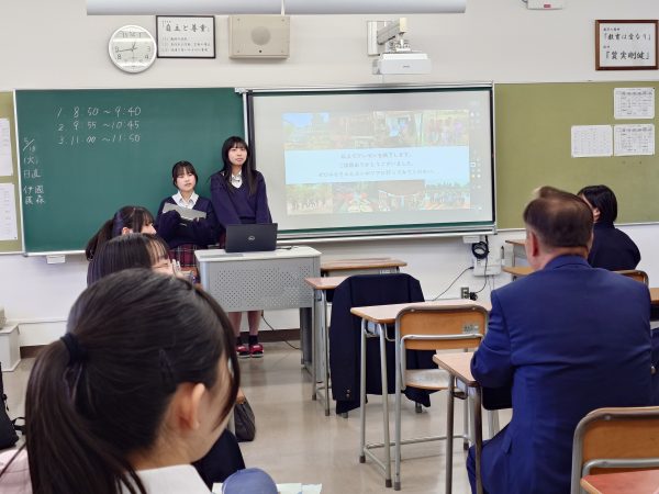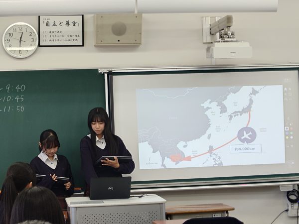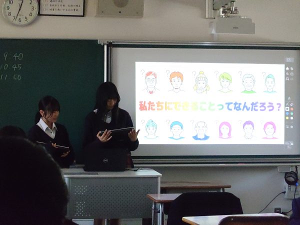 3年生の岡田さん、越智さんが、春休みにカンボジアでボランティアに参加した様子を発表してくれました。