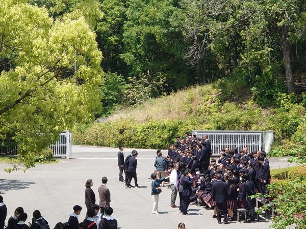 3年生がクラス写真を撮影していました。試験終了後、正門前ロータリーにクラス毎に集合。