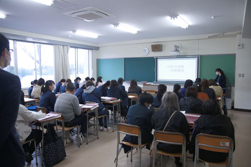 400名を超える入学予定者のため、新型コロナウイルス対策として、密を避けて午前、午後に分け、間隔を開けたり、消毒や換気に気を付けて等できるだけ配慮をしながらの開催になりました。