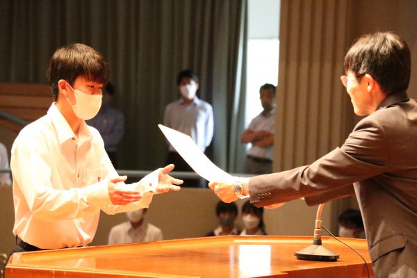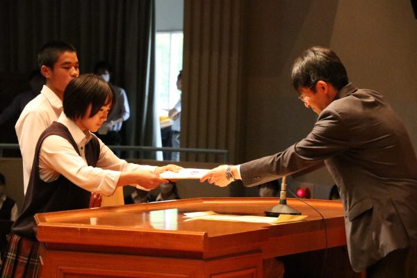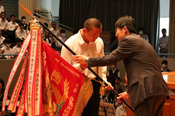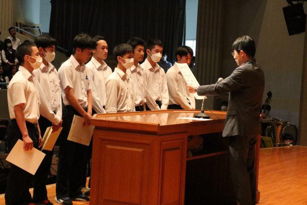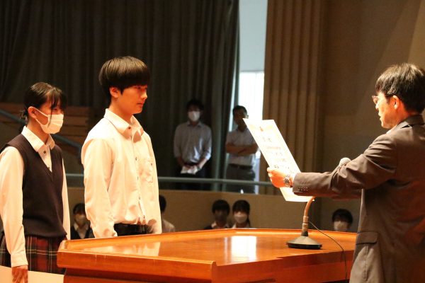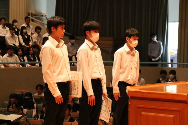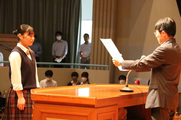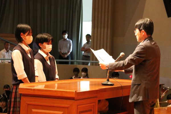 生徒会新役員認証式に続いて、各入賞披露、全国大会出場および全国大会につながる予選大会への出場する部活動の壮行式を行いました。