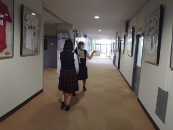 実際の時間に合わせ、校内を回りながら説明の練習です。