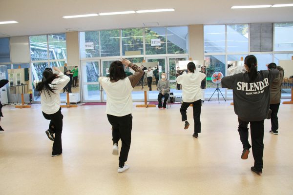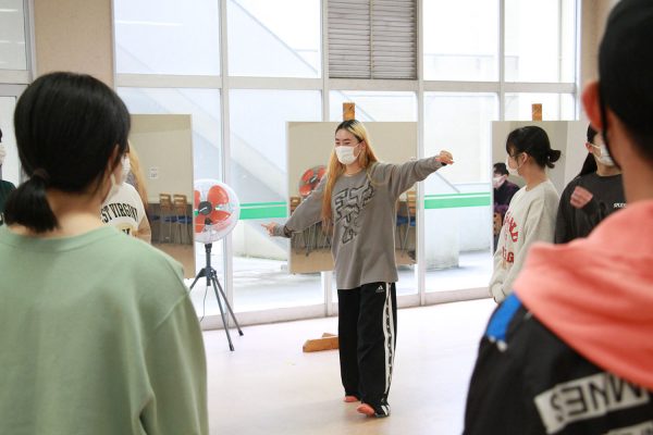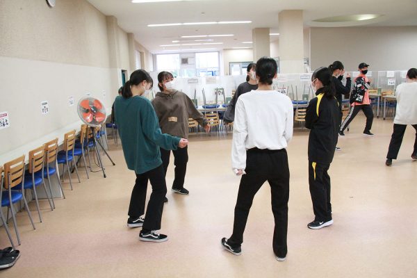 次に、ダンスのとても大切な基礎であるアイソレーションの練習を行いました。「アイソレーション」とは体のある一部分だけを『独立』させて動かす技です。普段の部活動からこの練習はしていますが、いつもとは違う視点やアドバイスがあり、生徒たちも困惑しながらも一生懸命ついていっていました。