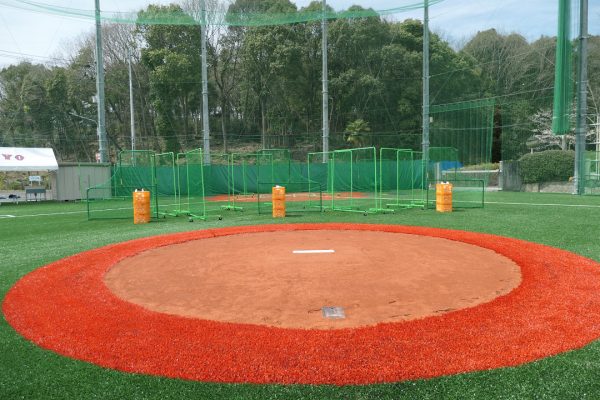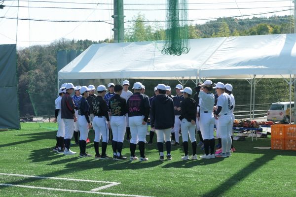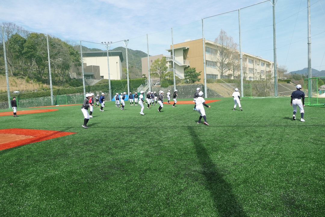 午前中にキレイに整備された人工芝のグラウンドで最初の練習の準備を整え、新入部員の到着を待ちます。青空も広がり、絶好の野球日和です。