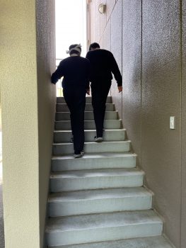 2人1組になり、目隠しをした状態で段差や階段を昇り降りします。