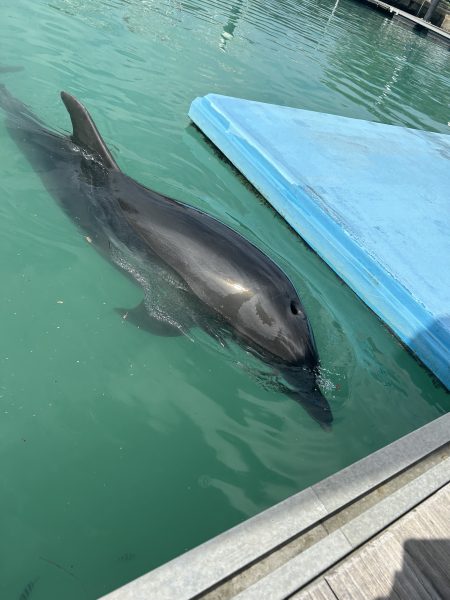 ○今回はイルカのアンちゃんとミラちゃんと遊びました。背中を触らせて貰いましたが濡れたナスのような手触りでした。私たちが右手大きく挙げ「ジャンプ!」と大声で言うとアンちゃんは大きく3回も飛んでくれました。最後に手を振ってくれてとても可愛かったです