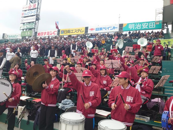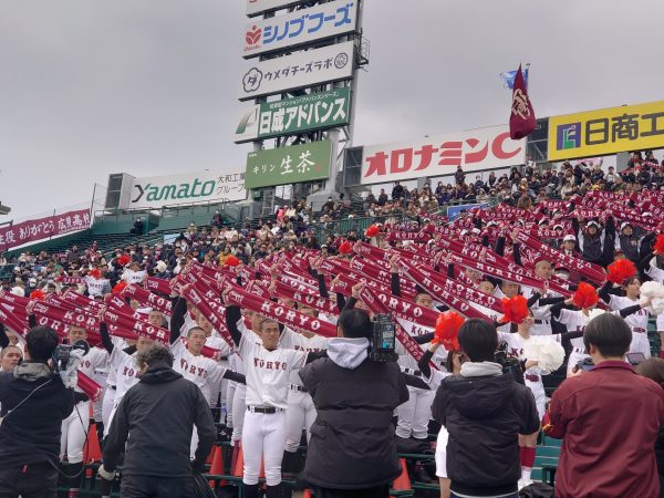 最高気温8℃、小雨や雪が降るとても寒い中でしたが、アルプススタンドの熱い応援の中、高知高校を3ー1で下し、2回戦進出を決めました。