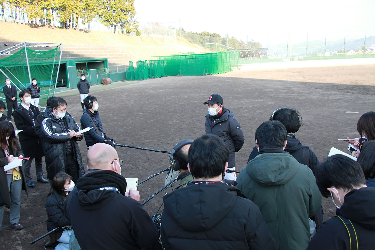 テレビ局など、報道陣の方々に囲まれながら、中井監督や川瀬キャプテンが取材を受けました。