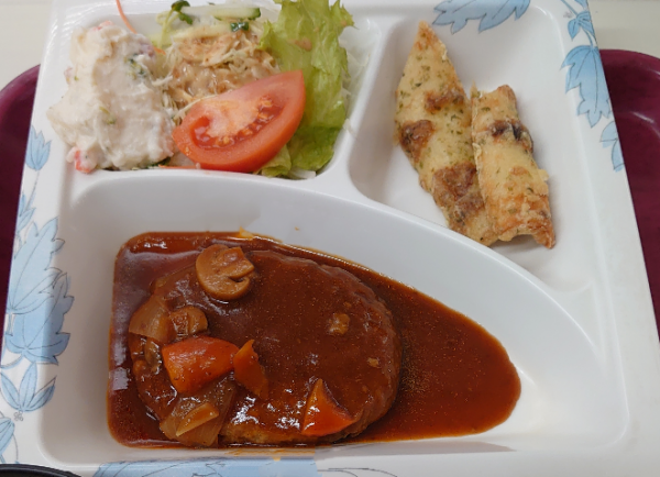 今回のメニューは「煮込みハンバーグ」です。 副菜はちくわの磯部揚げです。 普段のサラダに加えてポテトサラダもついていて満足感がありました!