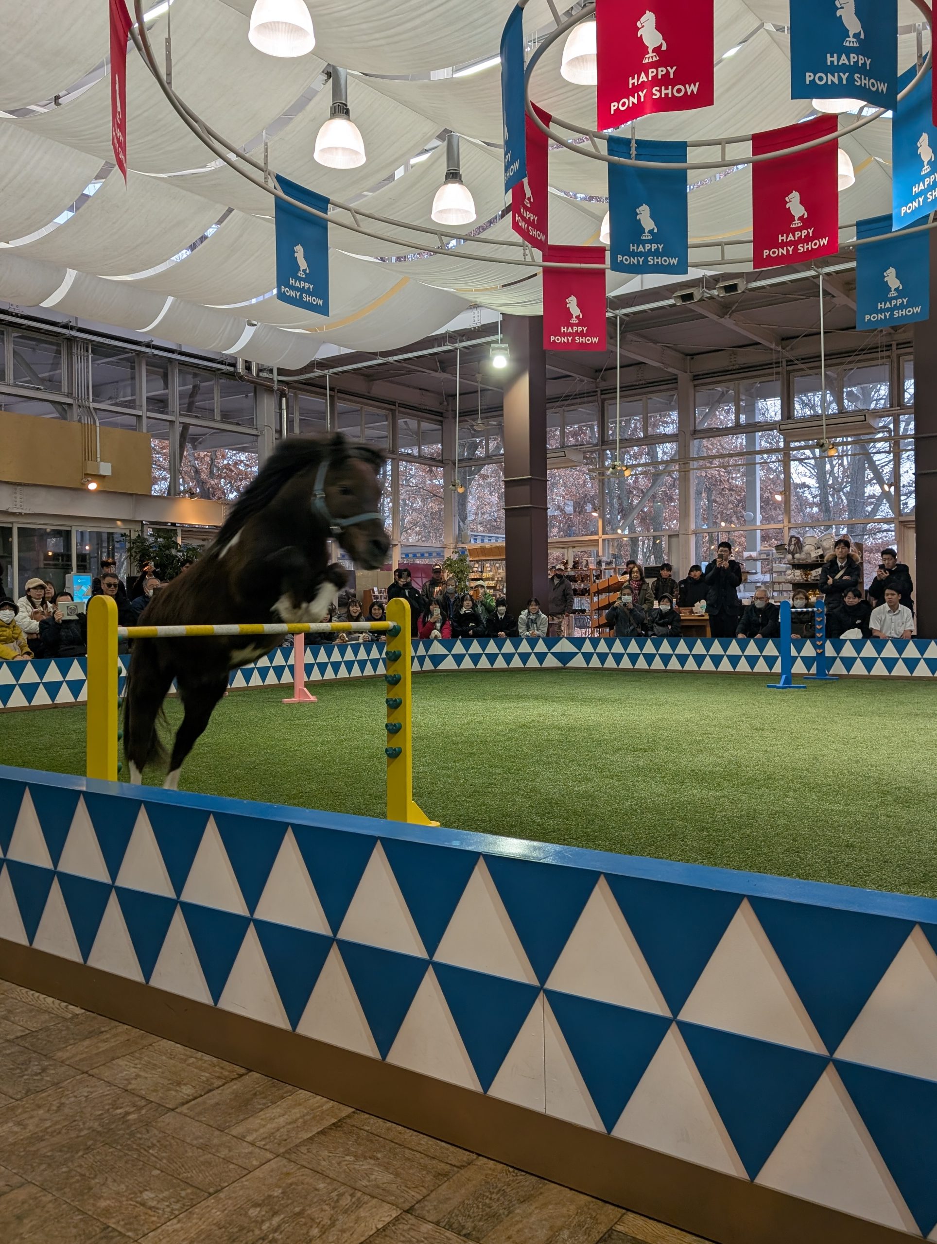 ◆修学旅行の1日目にはノーザンホースパークに行きました。そこで写真に写ってるポニーのちっちくんが飼育員の方とショーをしていました。そこでちっちくんは自分の視線と一緒の高さの障害物を飛び越えるショーを披露して見事に飛び越えれました。他にも観客に手を振ったり、2本足で立ったり、ボールを追いかけるなどすごいパフォーマンスをしていました。