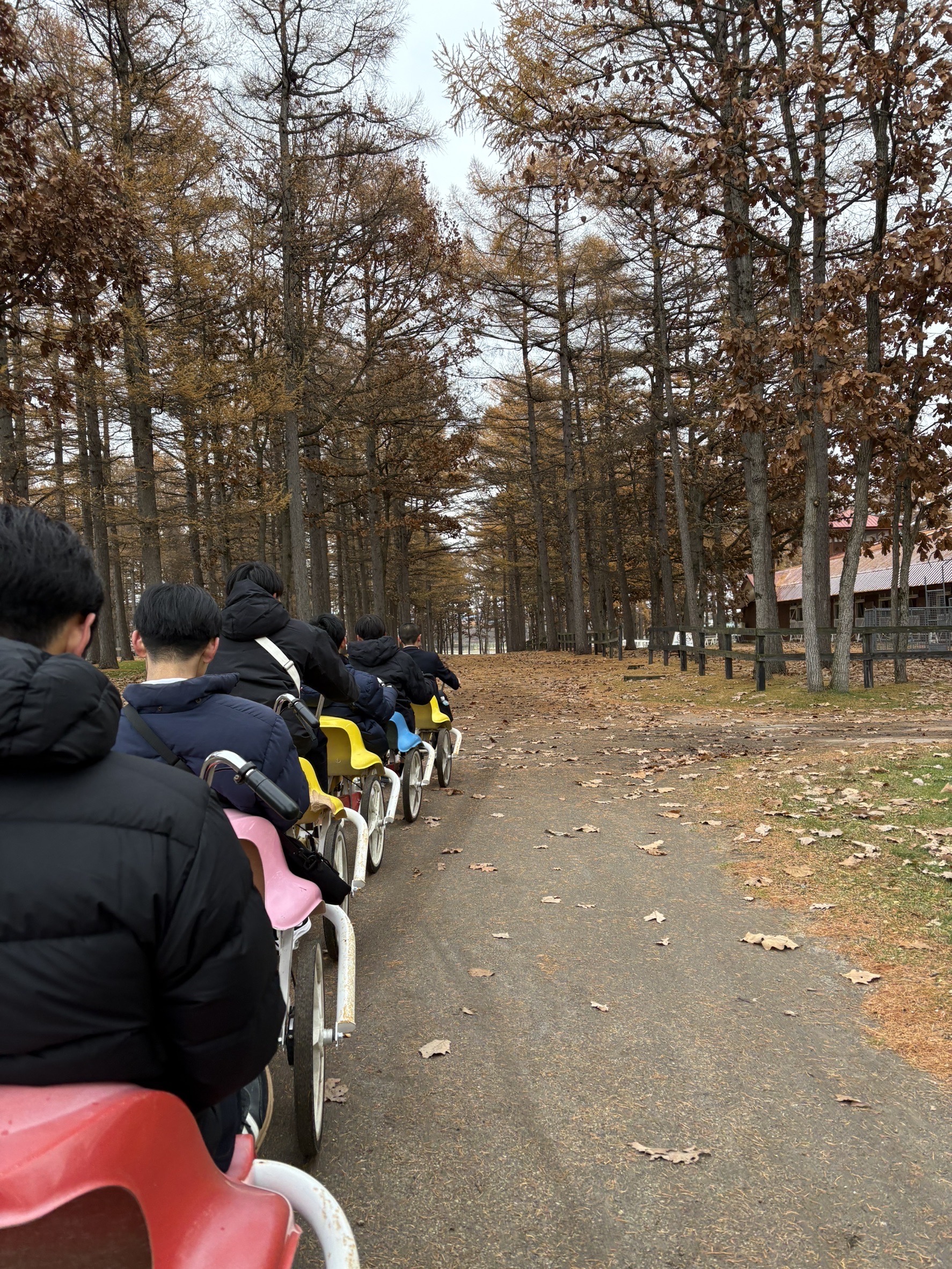 ◆ノーザンホースパークでクラスの人で8連結の自転車を漕いでいるところ。みんなで息を合わせて漕ぐのが楽しかった。たまにすれ違う同じ自転車に乗っている人たちとハイタッチも出来て交流も深められた。