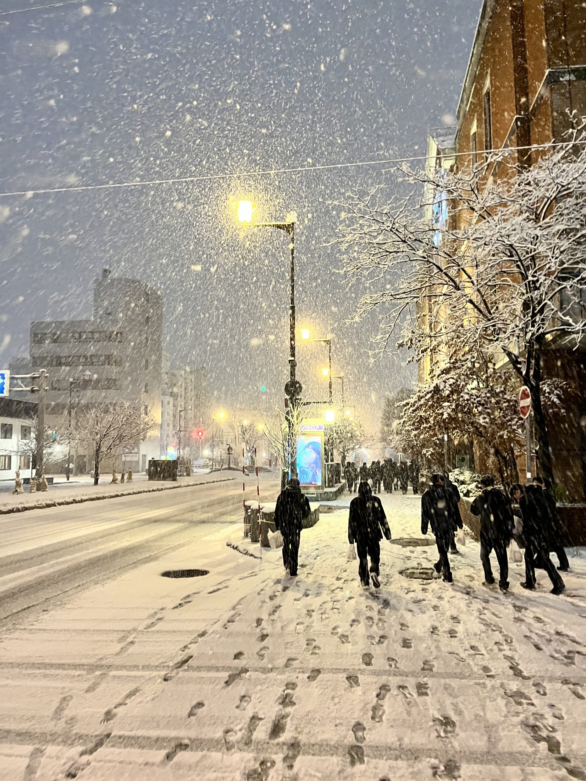 ◆コンビニに行った時にホテルの外の風景を撮った写真です。広島では11月に雪が降ることは滅多にないけど、北海道では11月でも雪が降ることは結構あるということに気付かされ、今自分が北海道にいるんだ。ということを改めて実感すると共に、これからの旅に期待と緊張を抱きました。あと修学旅行は3日もあるけどあっという間なので、一分一秒を噛み締めてこれからの旅を過ごそうと思いました。