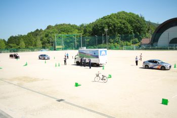 グラウンドで実施され、生徒もデモンストレーションに参加しながら、体験的に自転車の正しい乗り方について学ぶことができました。