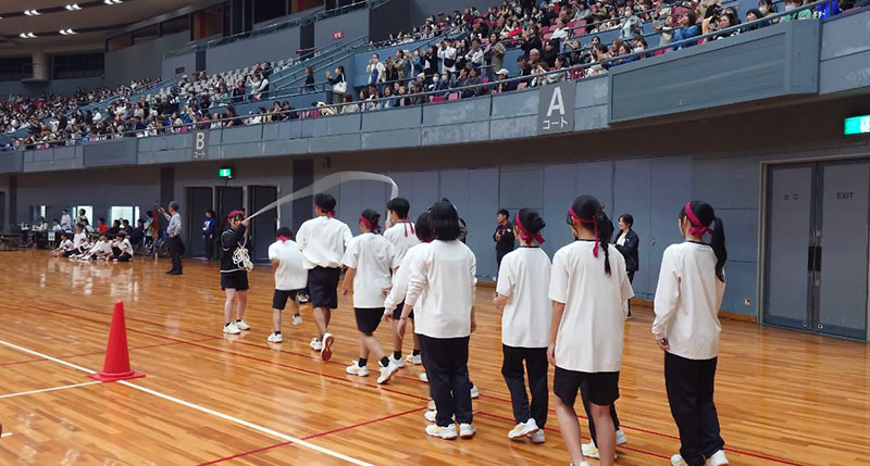 クラスが2グループに分かれて8の字に長縄を飛びました。待機しているチームが大きな声で応援している様子が印象的でした。
