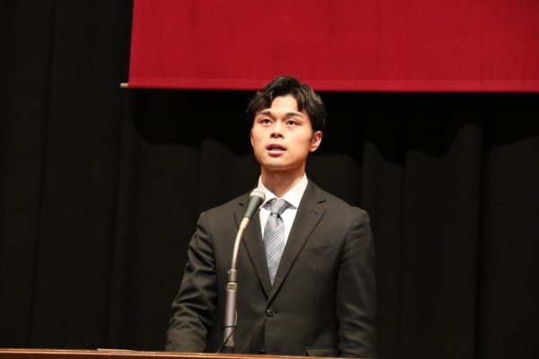 自身の高校生活を振り返ると、楽しいことも大変なこともあったが、先生方の励ましや支えもあってそれを乗り越え、人生の中でかけがえのない時間になった。4月1日から広陵高校に来ているが、毎日生徒の皆さんの元気な挨拶で頑張ろうと思うことができている。これから皆さんのサポートができるように新任教員一同頑張りたい、とお話いただきました。