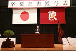 卒業生、保護者の皆様へ卒業のお祝いの言葉を述べられたのち、新型コロナウイルス感染防止対策を最大限取りながらの卒業式のため、様々な面で不自由をかけることにお詫びの言葉を述べられました。そして、現在はそのような不自由な生活を送っているが、「冬来たらば、春遠からじ」「弱気は最大の敵」という言葉を引用されることで、強気で果敢に挑戦する気持ちを忘れず、広陵高校で身に付けた「明るい笑顔の挨拶」「感謝の気持ち」「最後まであきらめない広陵魂」で、自らの運命をより良く変えていってほしいと激励されました。