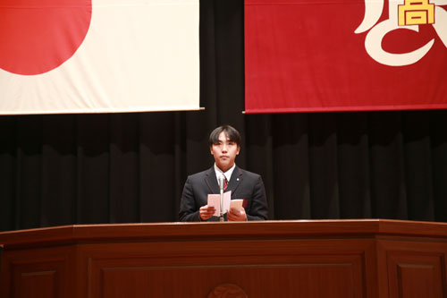 自分たちの学年は入試制度改革や新型コロナウイルスの影響により変化の多い学年だった。そのような変化の中、不安を感じることもあったが、仲間、先生、家族の助けにより乗り越えることができてきた。仲間は日ごろの何気ない生活の中で励まし合い、学校では施設の充実による不安払しょく、先生方は教師の目線、時には親の目線に立って指導をいただいた。家族とは時に反発や衝突もあったが、翌日にはお弁当を作って送り出してくれた。本当に感謝している。このように周囲には私たちを助けてくれる人が多くいることを忘れず、自由と責任を理解して、一日一日を大切に楽しんでもらいたいと言葉を送りました。