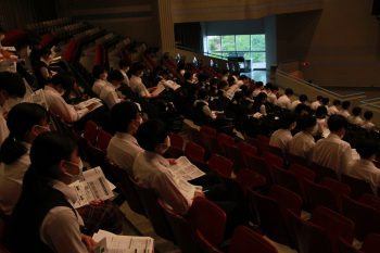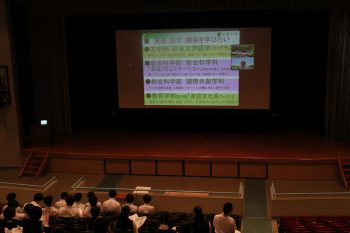 国公立大学ガイダンスでは、講堂で受験対策講座を受けた後、各会場に分かれ、先生方のお話を聞きました。その後、全体での大学説明が行われました。