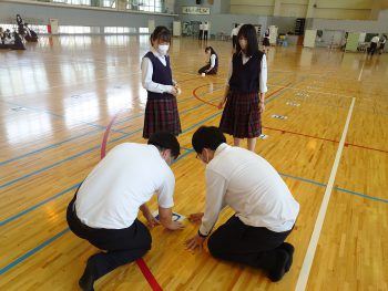 検診前には3年生の保健体育委員が準備を担当し、体育館内に距離を保つための足のマークを貼ったり、器具を並べたりと、手際よく進めていました。