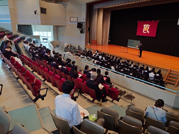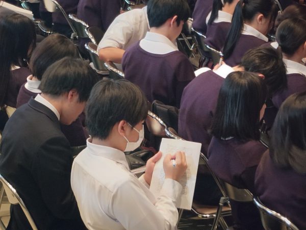今回は140名の生徒が参加し、志望理由の書き方や小論文の書き方についてメモを取りながら真剣に受講していました。