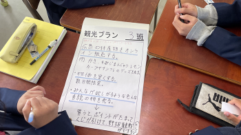 問題解決とプレゼンテーションの授業で、9班に分かれて「観光都市 広島」を救うというテーマで、どのような問題があって、どのように救うかなど話し合い、プレゼンテーションを行いました。短い時間でしたが、各班しっかり話し合い、いろいろなアイデアが出ました。日頃の授業でグループ活動が積極的に行われているようで、商品化できそうなレベルの提案もありました。