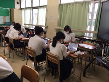 地歴公民の授業ではグループワークでコロナ禍の社会問題について考え、解決策をスライドにまとめて、発表する活動を行いました。