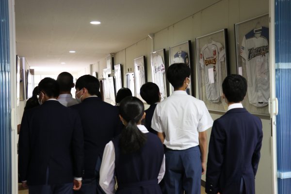 広陵高校出身のプロ野球選手が着ているユニフォームを飾っている廊下を見学しました。実は、一般の生徒も気軽に入ることができないところにあるので、貴重な体験だったかも知れません。