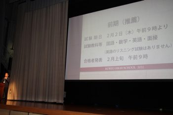講堂に戻り、本校教員による学校説明、入試委員長による募集概要の説明を行いました。