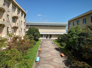 こちらは本館と生徒館をつなぐ渡り廊下から見た様子です。 向かって左側が4階建ての本館、右側が3階建ての生徒館、正面に見えるのが体育館です。