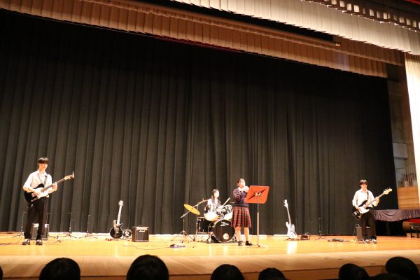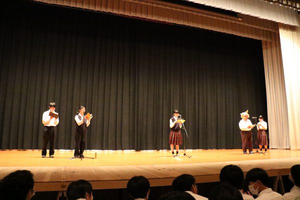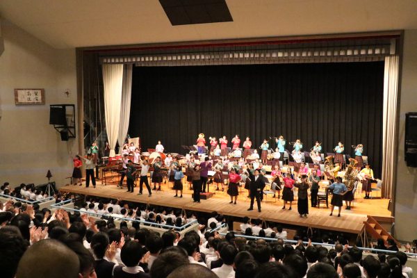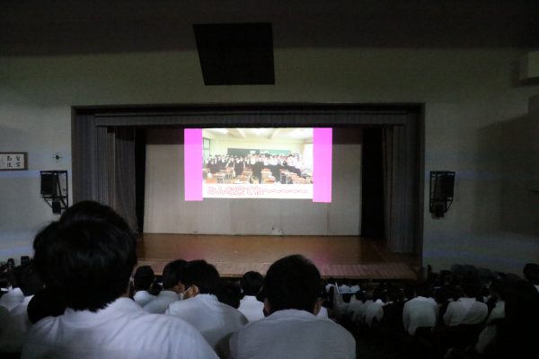 昨年度のステージ発表は3年生のみ講堂で鑑賞し、1・2年生はズーム配信により教室で鑑賞しました。今年は4年ぶりに全校生徒が揃って講堂で鑑賞することができました。