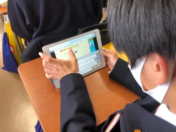 3,4時間目は学習の時間でした。この時間は明日から始まる授業に向けて、高校の学習の雰囲気をつかんでもらいたいという思いで設定しました。iPadやテキストを使って、一人ひとりが黙々と学習していました。
