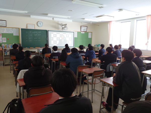 3年生の卒業考査が27日で終了し、今週から家庭学習期間に入るため、校長訓話を行いました。 クラスによって考査終了時間が異なるため、Zoom配信で実施しました。 皆さんにこれからの人生で大切にしてほしいことについて、イソップ童話や空海の言葉などを交えてお話されました。 校長訓話の後、学年主任の先生からの諸連絡を経て下校しました。