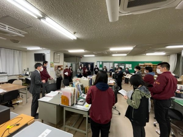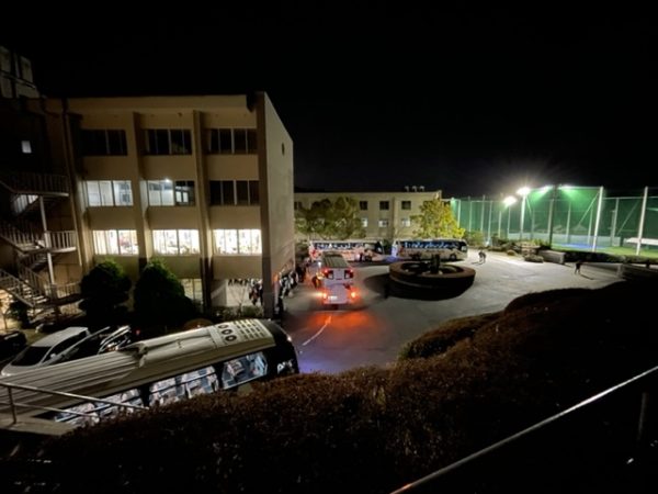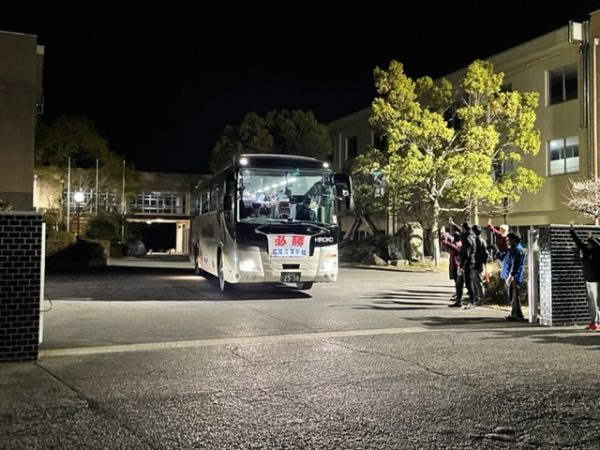 選抜高校野球初戦が明日(3/20)行われますが、野球部や吹奏楽部、ダンス部、そして希望応援の生徒や引率の教職員合わせて300名あまりが応援に向かいました。前日の今夜7時半に集合し、点呼や諸注意など行い、夜8時半にバス8台で甲子園に向かいました。