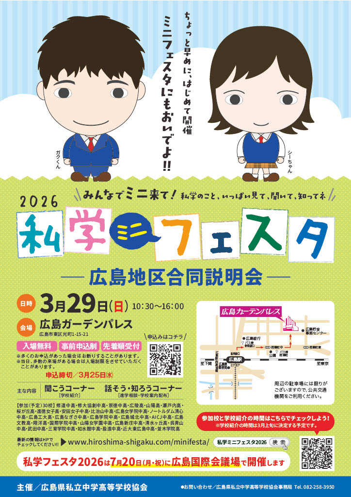 3月29日(日)に広島県私立中学高等学校協会主催の私学ミニフェスタ2026が広島ガーデンパレスで開催されます。もちろん本校も参加します。