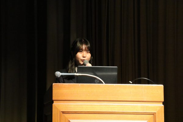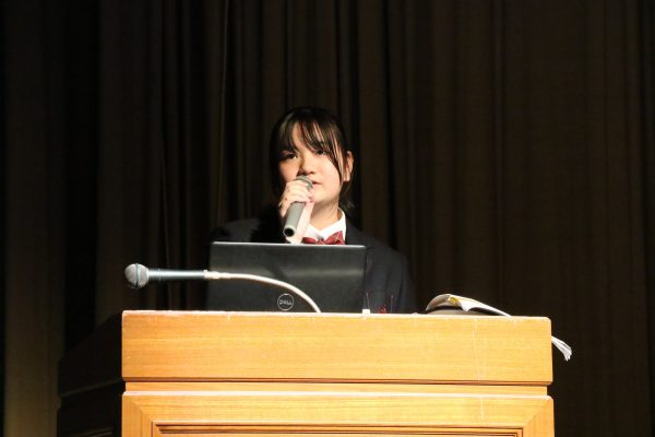 校内見学の後は再び講堂に戻り、生徒会執行部による学校説明を行いました。