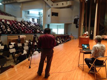 本来なら講堂に集合して実施している行事ですが、感染防止対策の観点から、講堂には関係者のみの入場とし、各教室に配信しました。