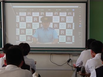先日、LHRの時間に安佐南警察署の方にお越しいただき、自転車の法令を守った利用についてお話をいただきました。 会議室から各教室への配信という形で実施し、自転車の盗難が増えている現状と対策、道路交通法に関するお話が主な内容でした。 お忙しい中本校までお越しいただき、ありがとうございました。