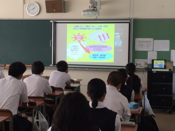 本校の学校薬剤師であり、広島県薬物乱用防止指導員の加藤 哲也先生にお越しいただき、各教室に配信する形で講演していただきました。