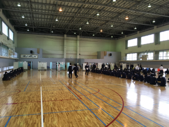 床に貼ってある足のマーク通りに間隔を空けて待機しています。 待機中に私語もなく、生徒の皆さんの協力のお陰でスムーズに進みました。 生徒たちは昨年の結果と見比べ、一喜一憂している様子でした。