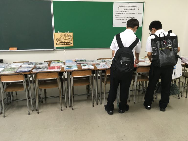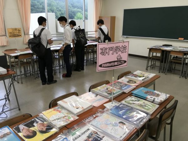 1学期、2学期の期末考査期間中に実施している恒例行事です。 生徒たちは会場に並べられている全国の様々な大学・専門学校の学校案内を自由に持ち帰ることができます。 学年を問わず多くの生徒が参加し、パンフレットを手に取っていました。 まずはどのような学校があるか知るところからスタートし、進路意識を向上させていきましょう。