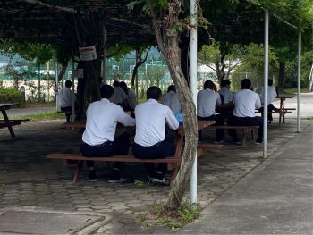 屋外で昼食をとる生徒も、向かい合わず、一方を向いて食べるよう指導しています。