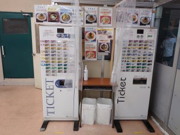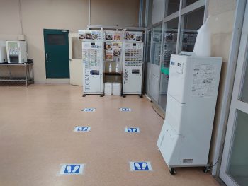 食堂内券売機には距離をとって並ぶよう表示を設置、券売機の間にはカーテンを設置