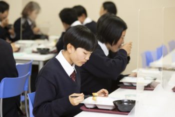恵風寮(女子寮)の生徒は校内の食堂で揃って昼食をとっています。 今年度寮生が増えたことに伴い、食堂の中に専用スペースが設けられました。