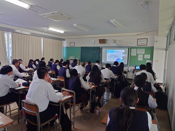 実際の企業の立場から、仕事観や自己分析の重要性、進路選択のポイントなどについて講話形式で伝えていただき、生徒たちは自らのことに置き換えながら真剣に耳を傾けていました。