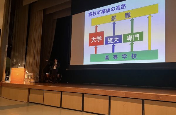 その後、学年主任から1年生の現状報告、教務部長からコース・科目選択についての話がありました。