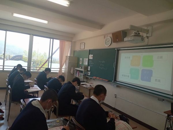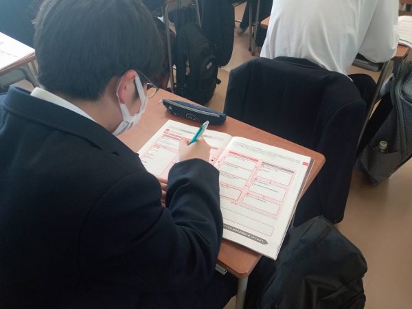 1学年はIIS(総合的な学習の時間)の時間を利用し、「進路ってどう考える?」というテーマに、自分の弱みや強みなどを書き出しました。自己理解と社会理解は、進路探究をしていく上で重要となります。また、自分の強みを知ることで進路の可能性を広げることができます。