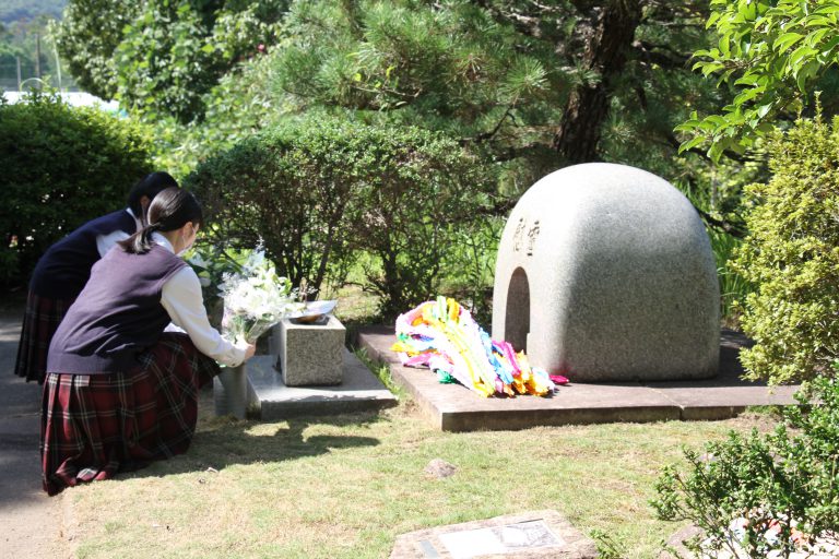 この折り鶴は全校生徒で心を込めて折り、代議員が糸に通して作成したものです。