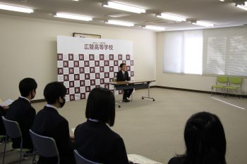 また、卒業式の際、元生徒会長の荒巻さんから皆さんへ、悔いのない高校生活を、そして新1年生たちとも力を合わせてよりよい広陵高校を作ってほしいというメッセージがあったことや、2年生の善行を紹介し、これからの高校生活を、高い志を持って夢や希望を実現できるように努力していこうと伝えられました。