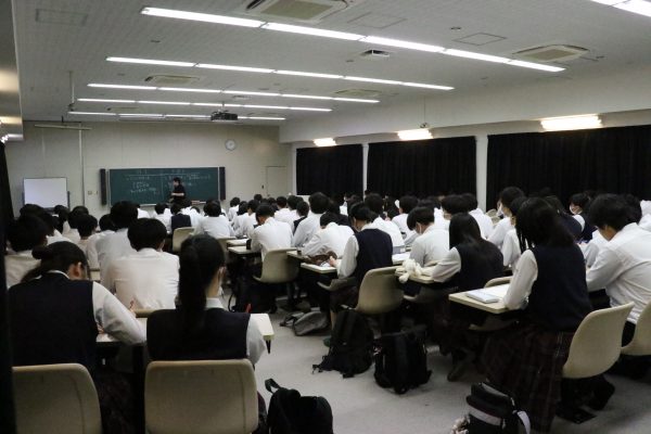 視聴覚教室も座席が足りなくなり、職員室からパイプ椅子を運びこんで満員御礼の小論文講演会となりました。